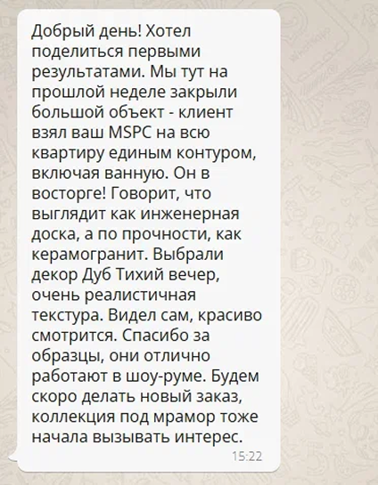 Хотим обратить внимание потенциальных партнеров из РФ и СНГ, которые хотели бы иметь в своем ассортименте mspc ламинат: все запросы, которые вы отправляете на производство в Китае, проходят модерацию в Москве. Мы готовы рассматривать поставки с брендированием под вашу ТМ: минимальная партия для заказа 10 000 м2. Для обсуждения этого вопроса свяжитесь по любому из удобных для вас каналов связи с нашей компанией.